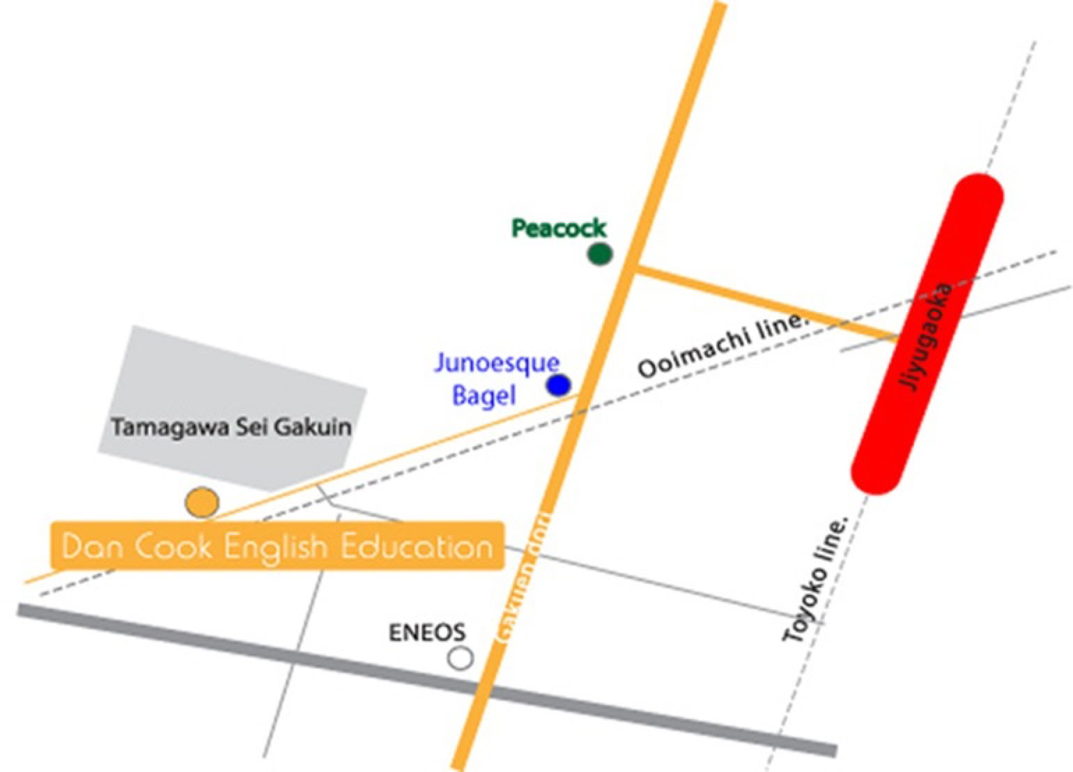 It is about a 5 minute walk from Jiyugaoka station. Leave from the main exit and walk to the Peacock supermarket. Turn left and walk straight to the Junoesque bagel Cafe. Turn right and walk beside the Oiimachi line until the next railroad crossing. I am on the corner across from Tamagawa Sei Gakuin.